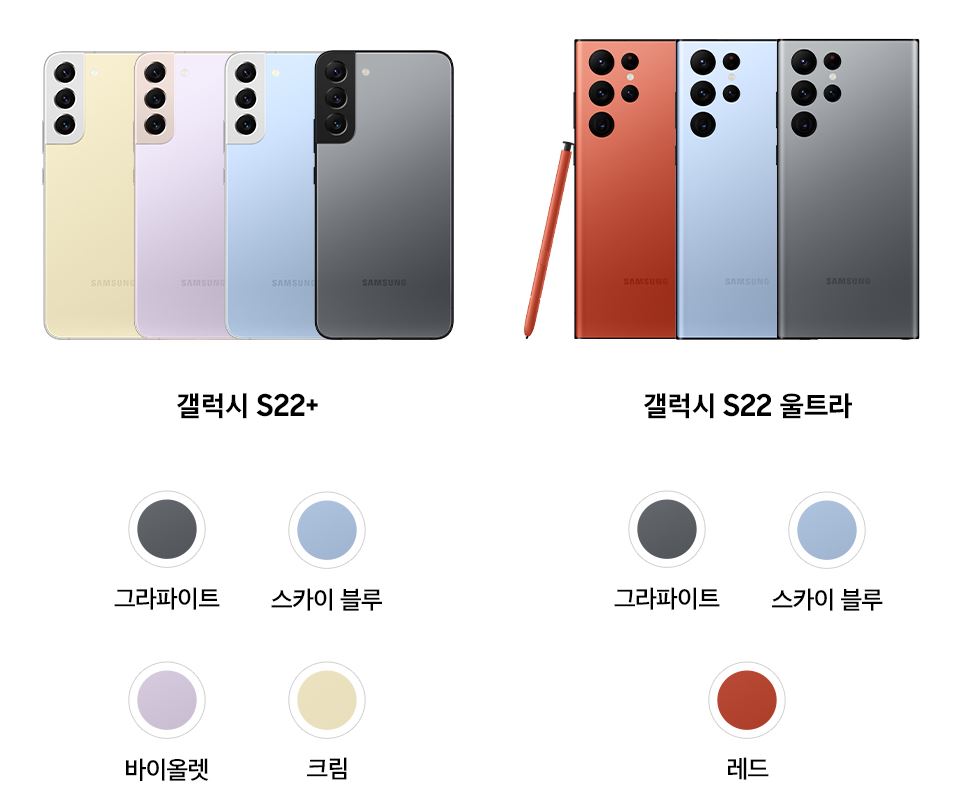 추가적으로 삼성전자의 공식홈페이지인 삼성닷컴에서만 구매할 수 있는 갤럭시 S22 색상이 있습니다. 갤럭시 S22 기본형과 플러스 단독 색상은 크림, 바이올렛, 스카이블루, 그랩화이트가 있고, 갤럭시 S22 울트라 단독 색상은 레드, 그랩화이트, 스카이블루가 있습니다.