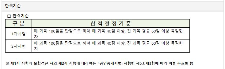 2022년 제33회 공인중개사 시험 합격기준은 1차, 2차 시험 모두 "매 과목 40점 이상, 전 과목 평균 60점 이상 득점"으로 동일합니다. 공인중개사 시험은 본인의 점수로만 평가받는 절대평가이기에 순위로 평가받는 상대평가보다는 심적 부담감이 적은 것 같습니다.
