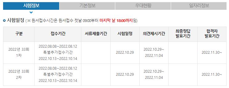 2022년 제 33회 공인중개사 시험일정은 1차와 2차로 나누어 신청할 수 있습니다. 공인중개사 1차, 2차 시험 접수기간은 2022년 8월 8일부터 8월 12일까지이고, 특별추가접수기간은 2022년 10월 13일부터 10월 14일까지입니다. 시험일정은 10월 29일, 합격차 발표는 11월 30일입니다.