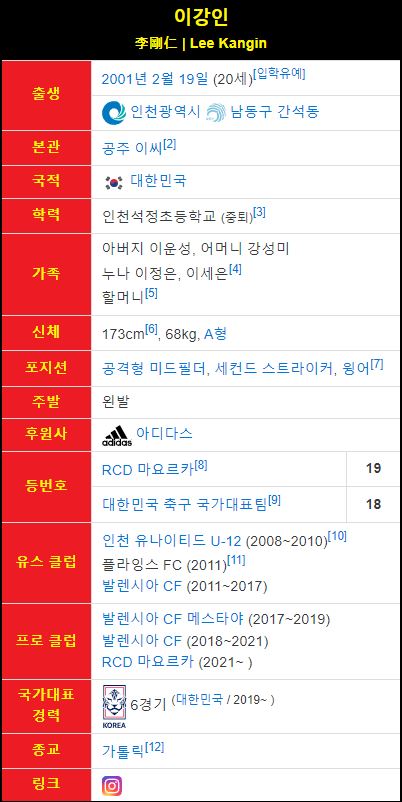 이강인 선수는 2021년 시즌부터 스페인 라리가 리그 RCD 마요르카 소속으로 이적하여 활동하고 있습니다. 이강인 선수는 인천광역시 남동구 간석동 출신으로 나이는 2001면 2월 19일 생으로 만 20세입니다. 키는 173cm이고 몸무게는 68kg으로 공격형 미드필더 및 세컨드 스트라이커로 활동하고 있습니다.