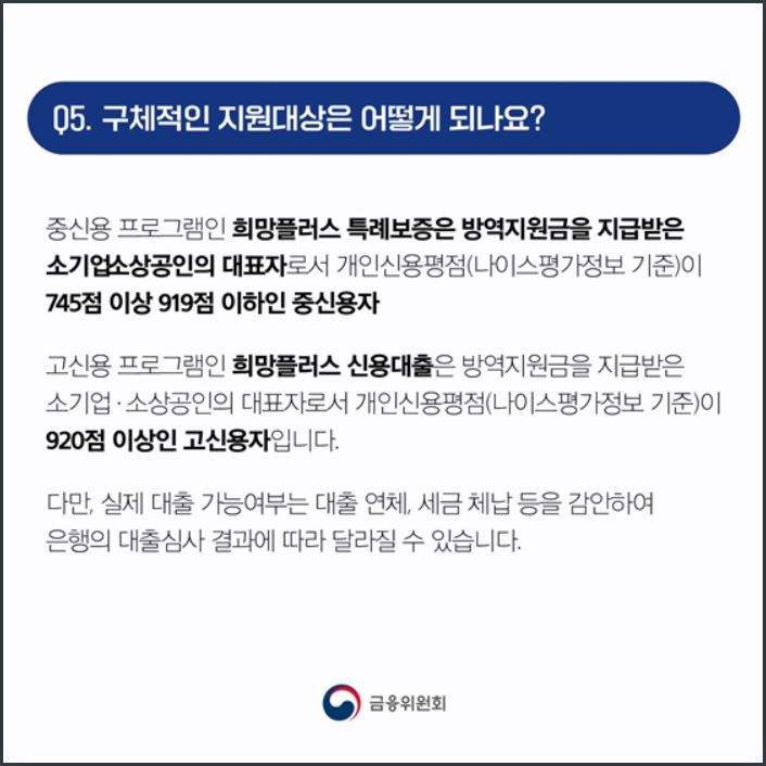 소상공인 방역지원금을 지급받은 사람(86만개사) 중 신용평점 745점 이상의 중신용자와 고신용자입니다.(저신용자의 경우에는 소상공인 희망대출을 이용하시면 됩니다.) 개인신용평점은 소상공인 대출신청 시점 NICE평가정보에서 조회한 점수를 적용합니다.