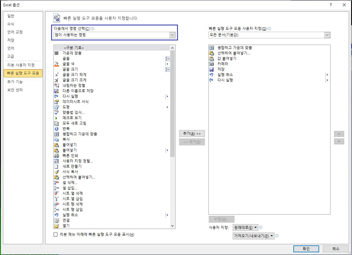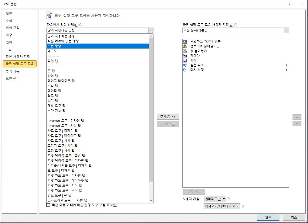 엑셀 빠른 실행 도구 모음 편집을 하려고 하는데, 왼쪽 공간에서 사용자가 원하는 기능이 없을 수 있습니다. 왜냐하면 기본적으로 명령 선택이 '많이 사용하는 명령'으로 되어있기 때문입니다. 왼쪽 상단 부분에 있는 옵션을 '모든 명령'으로 변경하면 찾지 못하였던 명령어를 찾을 수 있습니다.