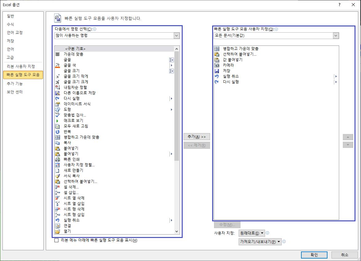 1번 방법을 통해서 열린 '빠른 실행 도구 모음'탭을 자세하게 보면 외쪽 공간에는 엑셀에 있는 모든 명령어가 나와있고, 오른쪽 공간에는 현재 빠른 실행 도구 모음 사용자 지정 현황을 볼 수 있게 되어 있습니다. 이 탭에서 '추가'와 '제거'를 통해 사용자 지정을 할 수 있습니다.