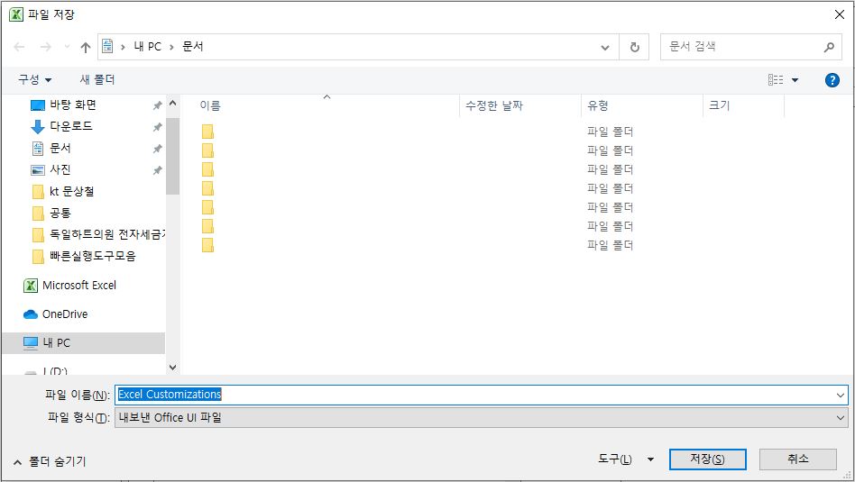 엑셀 빠른 실행 도구 모음 탭 오른쪽 하단부분에 '사용장 지정' - '가져오기/내보내기'가 있습니다. 쉽게 이야기하면 사용자가 지정한 빠른 실행 도구 모음을 다른 엑셀 사용자에게 공유할 때 사용하는 기능입니다. '가져오기/내보내기'를 클릭하여서 '모든 사용자 지정 항목 내보내기'를 클릭해주면 'Excel Customizations'이라는 이름으로 Office UI 파일을 저장할 수 있습니다.