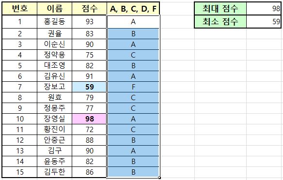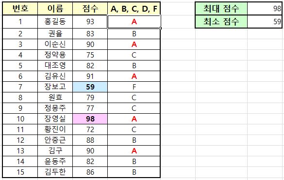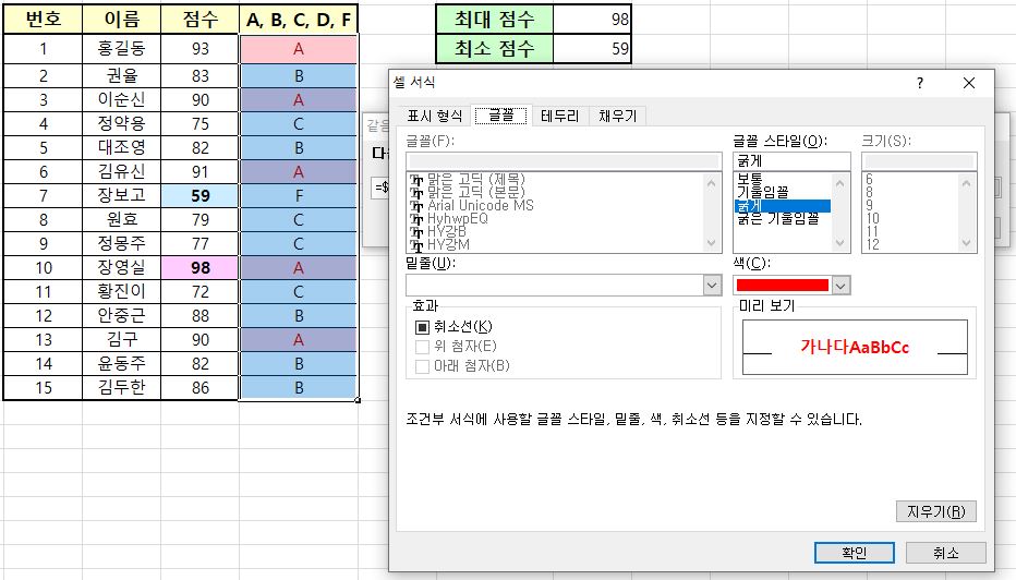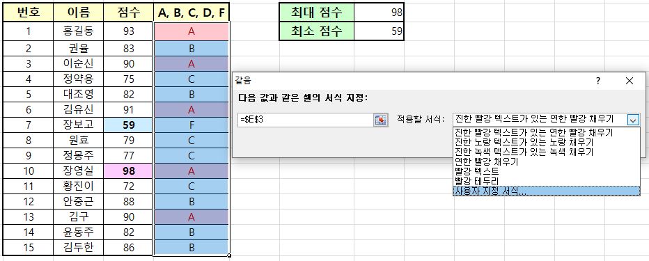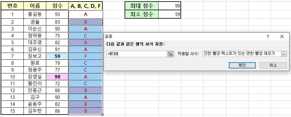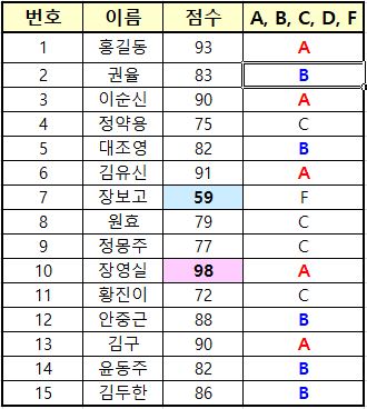 'E5:E15' 범위안에 있는 A등급인 셀 E3, E5, E8, E12, E15셀의 텍스트 수식이 엑셀 조건부 서식에 의해서 변경 되었습니다. 같은 방법으로 B를 중복값으로 설정하고 엑셀 조건부 서식을 적용시키면, 조건부 서식에 의해서 E4, E7, E14, E16, E17셀의 텍스트 수식이 변경 되었습니다.