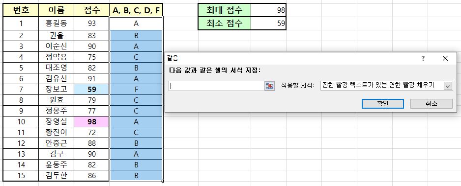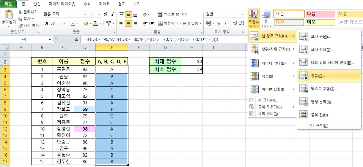 예시에서 중복값을 나타낼 셀의 범위, 등급이 나타나져 있는 셀 범위인 'E3:E17'를 클릭한 뒤 엑셀 상단 메뉴 '홈' -> '조건부 서식' -> '셀 강조 규칙' -> '같음'을 클릭하면 지정한 셀의 범위 'E3:E17'에 대한 엑셀 조건부 서식 같음 창이 활성화 됩니다.