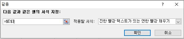 활성화된 조건부 서식에서 '다음 값과 같은 셀의 서식 지정'이라는 공간에 사용자가 처음에 지정한 셀의 범위인 'E3:E17'안에서 중복값으로 나타내고 싶은 셀을 클릭해 주고, 우측에있는 적용할 서식 중에서 본인이 원하는 서식을 선택한 후 확인을 클릭하면 중복값이 표시되면서 완성이 됩니다.