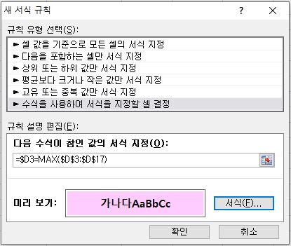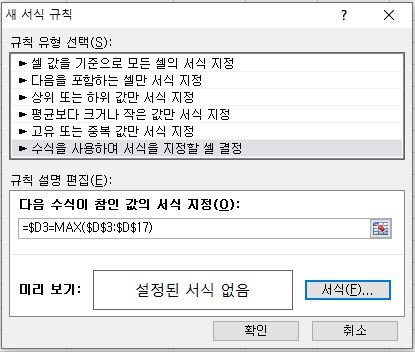 먼저 참인 값의 MAX 함수식인 =$D3=MAX($D$3:$D$17)을 입력한 후 '서식' 버튼을 눌러서 산출되는 결과값에 대해 원하는 형태로 수정해주면 됩니다. 저는 셀 배경을 변경할 예정이기 때문에, '체우기'에서 배경색을 지정한 후 확인을 클릭하면 미리보기란이 변경된 것을 확일 할 수 있습니다.