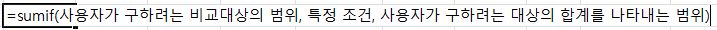 두 번째, SUMIF 엑셀 함수는 사용자가 지정한 특수한 조건에 해당되는 품목을 찾아주고 찾은 인수의 합을 구하는 엑셀 수식으로 형식은 'SUMIF(사용자가 구하려는 비교대상의 범위, 특정 조건, 사용자가 구하려는 대상의 합계를 나타내는 범위)'로 구성되어 있습니다.