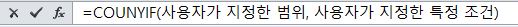 두 번째, COUNTIF 엑셀 함수입니다. COUNTIF는 COUNT와 IF가 조합된 수식으로 지정한 범위에서 특정한 조건에 해당하는 셀의 개수를 합해주는 기능을 가진 수식 함수입니다. 구성 형식은 '=COUNTIF(사용자가 지정하 범위, 사용자가 지정한 특정한 조건)'으로 구성되어 있습니다.