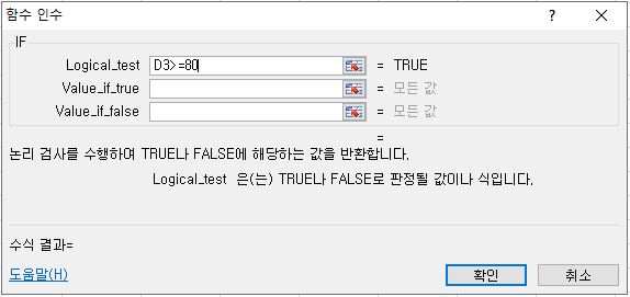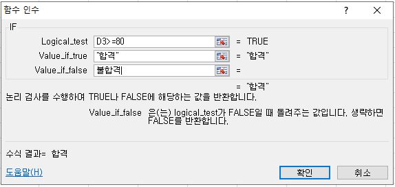 저는 '시험점수 80점 이상을 기준으로 합격과 불합격' 결과값을 산출해보겠습니다. IF 함수 인수 창 Logical_if_test에는 조건식으로 'D3>=80'을 입력해 줍니다. 그리고 Value_if_true에는 '합격'을 Value_if_false에는 '불합격'을 입력하고 확인을 눌러 if 엑셀 함수를 완성시켜 줍니다.