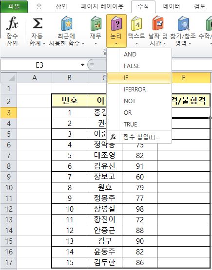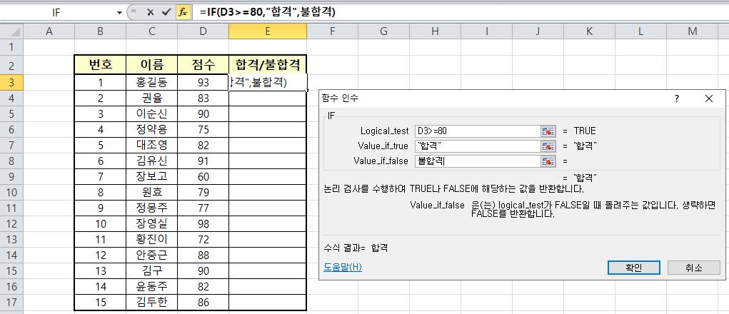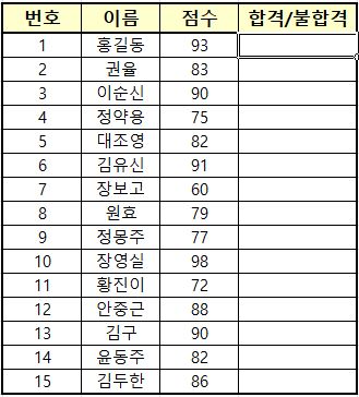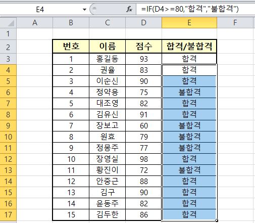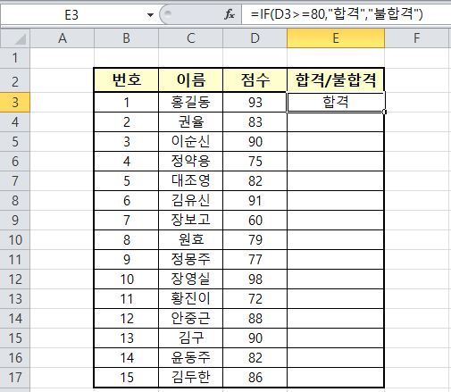 그러면 'E3셀'에는 '합격'이라는 결과값이 산출되어 표시됩니다. 93점 맞은 홍길동은 80점 이상이기 때문에 '합격'을 받았습니다. 그럼 나머지 14명에 대한 합격&불합격 결과값을 산출해보겠습니다. E3셀 수식을 복사여 E4셀부터 E15셀까지 붙여넣기 해주시면 됩니다.