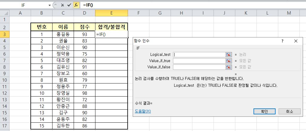 저는 첫 번째 방법을 사용하여 IF 함수를 사용해보겠습니다. 위 예시에서 '합격', '불합격' 결과값을 입력할 E3셀을 클릭하고 '=IF('까지 입력하고 IF 함수 인수 창을 활성화 시켜줍니다. Logical_test, Value_if_true, Value_if_false 총 세개의 입력칸이 나옵니다.