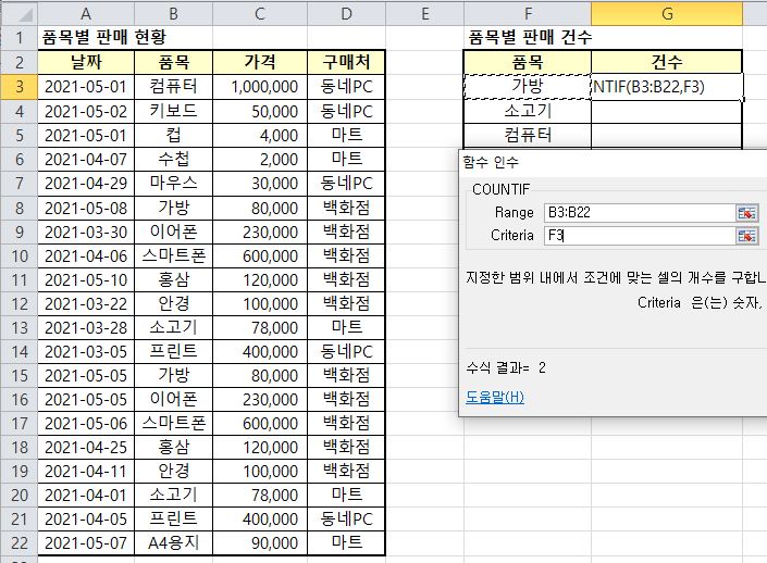 위 예시에서 COUNTIF 함수를 활용하여서 품목별 판매 건수를 알아보겠습니다. 결과 값을 구하고자 하는 G3 셀을 클릭한 뒤 =COUNTIF( 혹은 함수 마법사 -> 함수 인수 창을 열어줍니다. COUNTIF 함수 인수 창에는 Range 와 Criteria 두 가지 값을 입력할 수 있는 부분이 나타나게 됩니다.