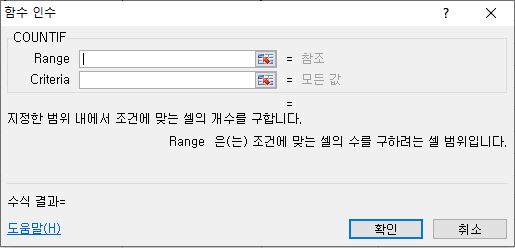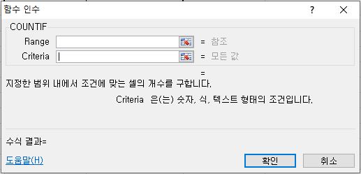 개인적으로는 함수를 사용할 때, 본인이 아직 엑셀 사용이 익숙하지 않으신 분들은 함수 인수 창을 활용하여서 사용하시는 것을 권장드립니다. countif 함수 인수 창을 활용하면 보다 쉽게 사용이 가능하며 초보자 일수록 큰 도움이 되실꺼라 믿습니다.