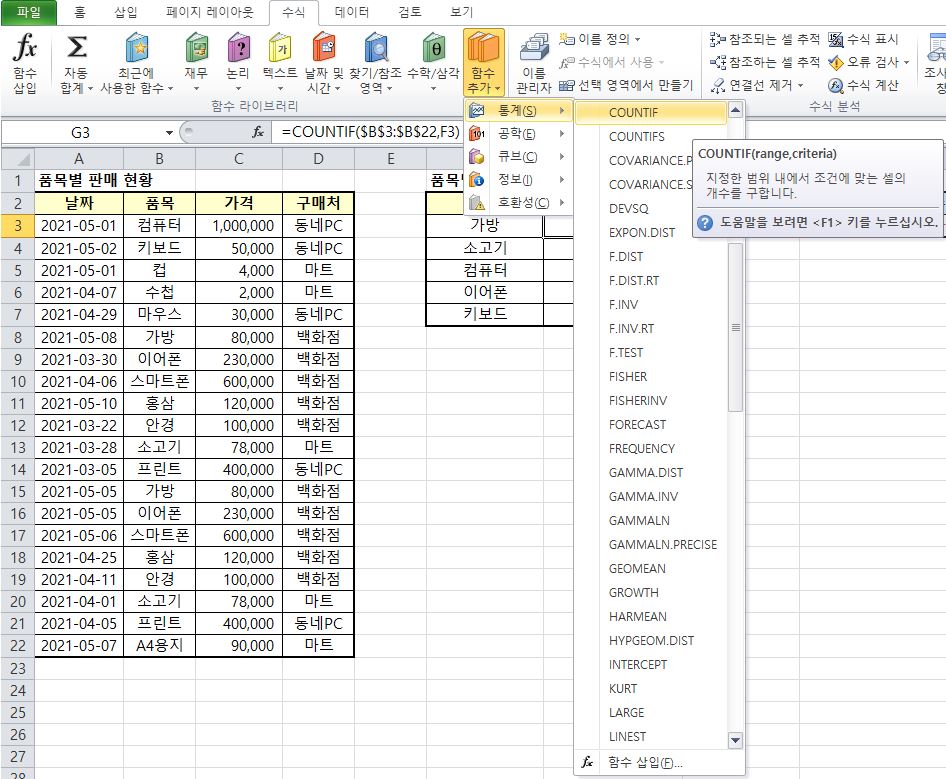 엑셀 상단 메뉴 '수식' -> '함수 추가' -> '통계' -> 'COUNIF'를 클릭하여 사용하거나 엑셀 상단 메뉴 '수식' -> '함수 삽입' -> '함수 마법사' -> 'COUNTIF'를 클릭하여서 사용하는 방법이 있습니다. 두 방식을 이용하면 COUNTIF 함수 인수 창이 열리면서 보다 쉽게 활용할 수 있습니다.