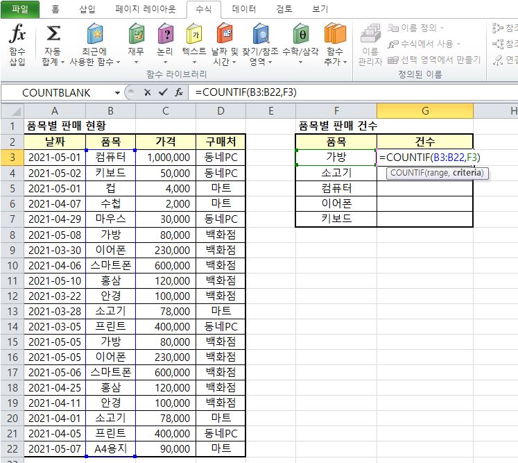 위에서 COUNTIF 함수에 대하여 알려드렸습니다. 지금부터는 위에서 알려드린 COUNTIF 함수 형식에 맞게 예시를 보여주면서 사용법을 알려드리겠습니다. 엑셀에서 COUNTIF 함수를 사용하기 위해서는 값을 구하고자 하는 셀에 '=COUNTIF('를 입력하여서 사용하는 방법이 있고,