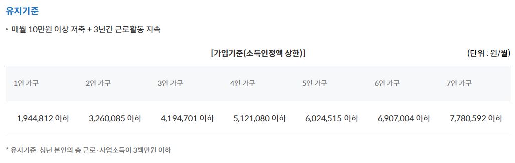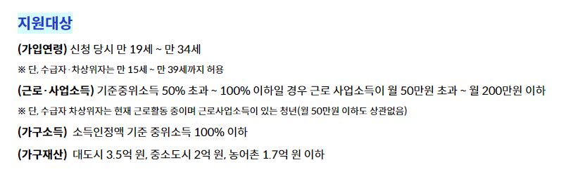 청년 내일저축계좌 자격조건은 대한민국 국민으로 만 19세이상 34세이하의 청년이면서, 근로소득이 월 50만원 초과 200만원 이하, 가구소득 기준 중위소득 100%이하여야 합니다. 그 외 재산기준으로 대도시 3.5억원 이하, 중소도시 2억원 이하, 농어촌 1.7억원 이하여야 합니다.