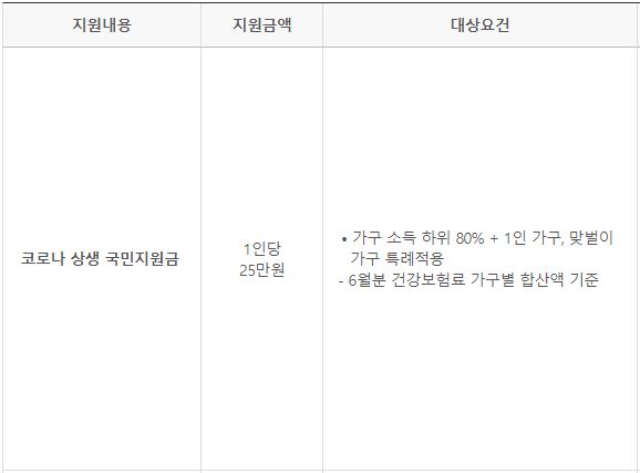 여기서 이번 포스팅 주제인 5차 재난지원금에 직접적으로 해당되는 부분은 '코로나 상생 국민지원금'입니다. 5차 재난지원금 - 코로나 상생 국민지원금 대상자 기준은 '가구 소득 하위 80%'입니다. 단. 1인 가구와 외벌이 가구 그리고 맞벌이 가구는 특례가 적용될 예정입니다.