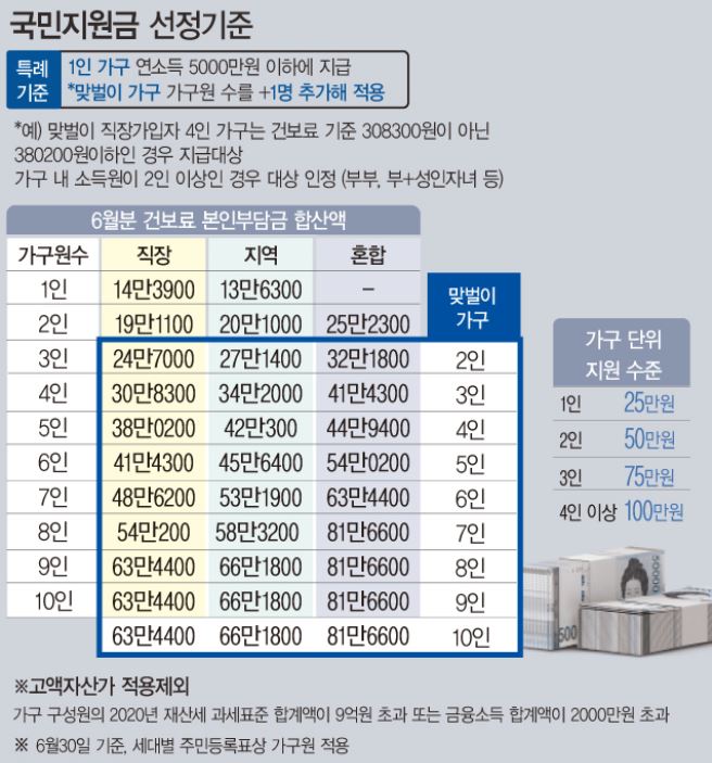 5차 재난지원금 - 코로나 상생 국민지원금 건강보험료 기준에서 2인 이상은 외벌이 가구와 맞벌이 가구로 나누어져 서로 다른 기준금액이 측정되어 있습니다. 정확한 금액은 위 표로 대체하겠습니다. 위 표를 확인해보면서 해당여부를 꼭 확인하시기 바랍니다.
