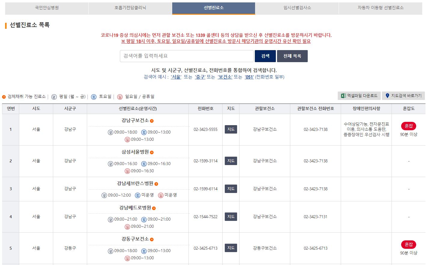 코로나19 선별진료소 현황 홈페이지