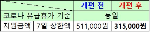 개정 전 코로나 유급휴가 지원금은 7일 자가격리 기간 시 7일 최대 511,000원 지원 받을 수 있었지만, 코로나 유급휴가 지원금이 개정되면서 7일 자가격리 기간 시 7일 최대 315,000원을 사업주가 지원 받을 수 있게 되었습니다.