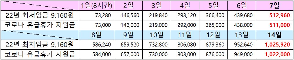 2022년 2월 14일 기준, 오미크론 코로나 유급휴가 지원금 금액은 1일 최대 130,000원에서 1일 최대 73,000원으로 하향 조정 되었습니다. 1일 최대 73,000원은 2022년 최저임금 시간당 9,160원, 8시간 기준 73,280원에 맞추었다고 정부에서 발표하였습니다.