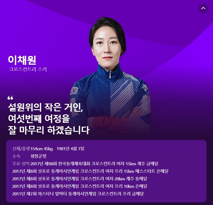 은퇴번복을 하고 복귀한 불혹의 나이를 넘기 이채원 선수의 실력과 기량은 젊은 선수들보다 앞어있는 상태였습니다. 실제로 이채원 선수는 지난해 진행된 국가대표 선발전에서 1위로 결승선을 통과하면서 동계올림픽 출전권을 따냈습니다.