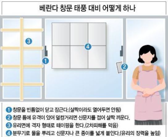 태풍은 건물 전체적으로 영향을 주기 때문에 건물과 집안 드의 문과 창문을 닫고 외출을 자제하시는 것이 좋습니다. 특히 외부에서 바람에 날아간 지붕, 간판 등에 의해서 해를 받는 경우가 많으니 이 부분을 꼭 조심하고, 손전등, 식수 등을 준비해 놓는 것을 추천드립니다.