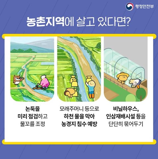 태풍은 강우와 동반해서 오기 때문에 강우로 인한 피해도 대비하여야 합니다. 특히 외부에 주차해놓은 자동차가 침수될 위험이 있으니, 자동차는 침수 위험지역에서 이동시키는 것이 안전합니다. 그리고 간판, 비닐하우스, 선박 등의 시설은 튼튼한 끈으로 고정해주시는 것이 위험에서 안전할 수 있습니다.