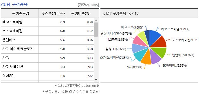 TIGER 2차전지테마 ETF는 기초지수로 WISE 2차전지 테마를 추종하고 있습니다. TIGER 2차전지테마 ETF에 가장 큰 특징은 구성 종목의 1개 종목 비중 상한 10%라는 것입니다. 그리고 2차전지 3대 종목이라 불리는 삼성SDI, LG화학, SK 이노베이션의 비중이 2021년 10월 6일 기준 6~7%이고, 중소형주 비중이 상대적으로 높습니다.
